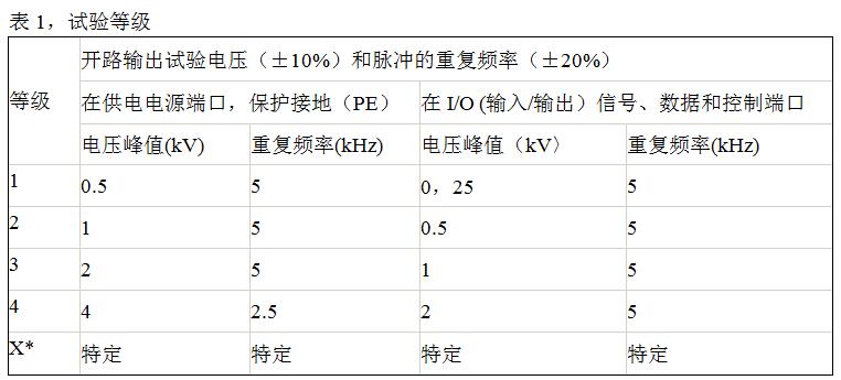 表1列出了设备的供电电源、保护接地(PE)、信号和控制端口进行电快速瞬变脉冲群抗扰度试验时应优先采用的试验等级的范围。